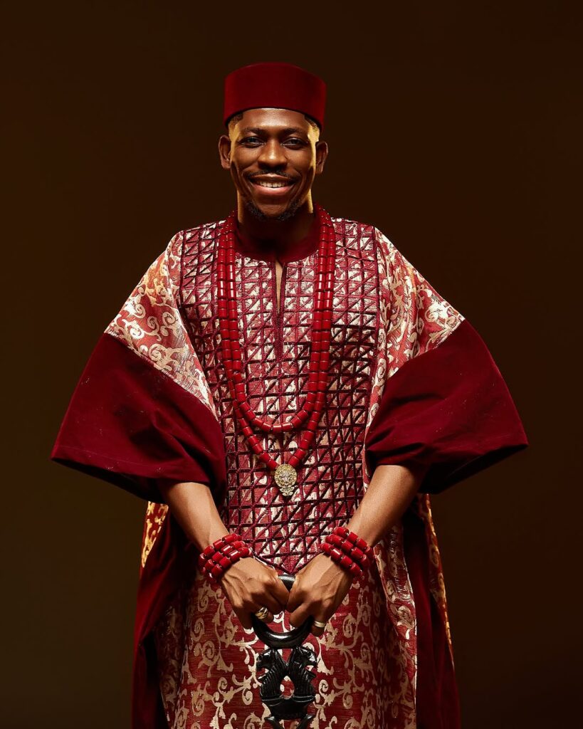 Dressed in a striking deep red and gold agbada, Moses exudes elegance and tradition. The richly embroidered outfit, complemented by a matching red cap, a staff, and layers of coral beads, gives off a royal touch fitting for the milestone.