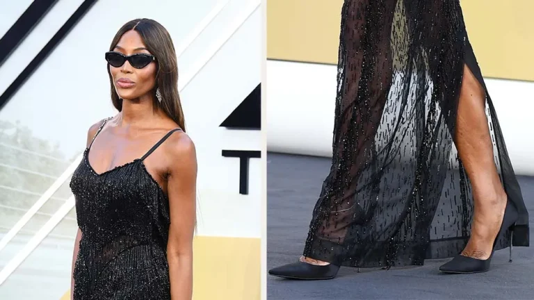 Wearing a show-stopping black gown that hugged her frame perfectly, Naomi effortlessly served elegance with an edge. The dress, detailed with beaded fringe and a daring slit, shimmered with every step, revealing just enough of her famously long legs. Its semi-sheer skirt brought a modern twist to timeless glamour.