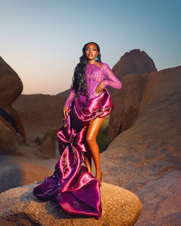 The actor and model marked her new age with a breathtaking photo shoot in Namibia. Dressed in a flowing purple satin skirt paired with a lace bodysuit, she struck poses against dramatic rocky landscapes. The contrast of her outfit’s fluid movement against the rugged backdrop gave the images an otherworldly, editorial feel. Bold turquoise earrings and soft, wavy hair tied the look together with a pop of vibrance.