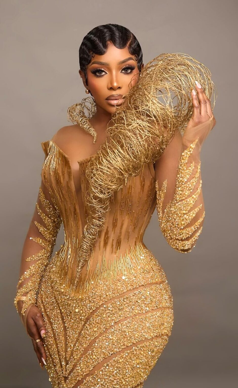 Dressed in a custom Veekee James masterpiece, Chioma owned the night in a look that shimmered with elegance and power. The gown sculpted her silhouette perfectly — a fitted corset bodice cinched at the waist, flowing into a sleek, curve-loving skirt that moved like magic. But the real showstopper? That neckline. Bold, low-cut, and beautifully framed with sculpted shoulder detailing that felt more like wearable art.