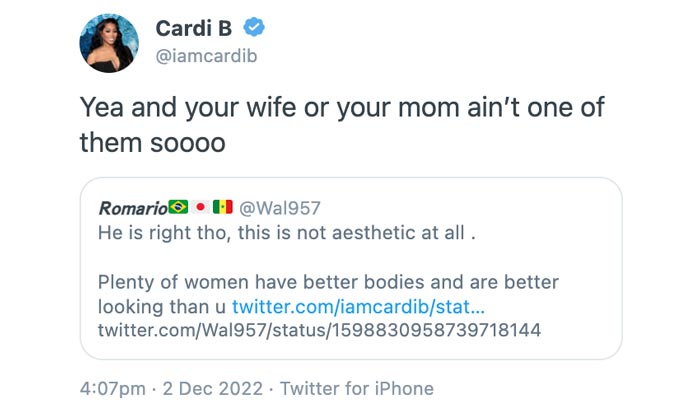 Cardi B Shuts Down Troll Who Insults Her Looks