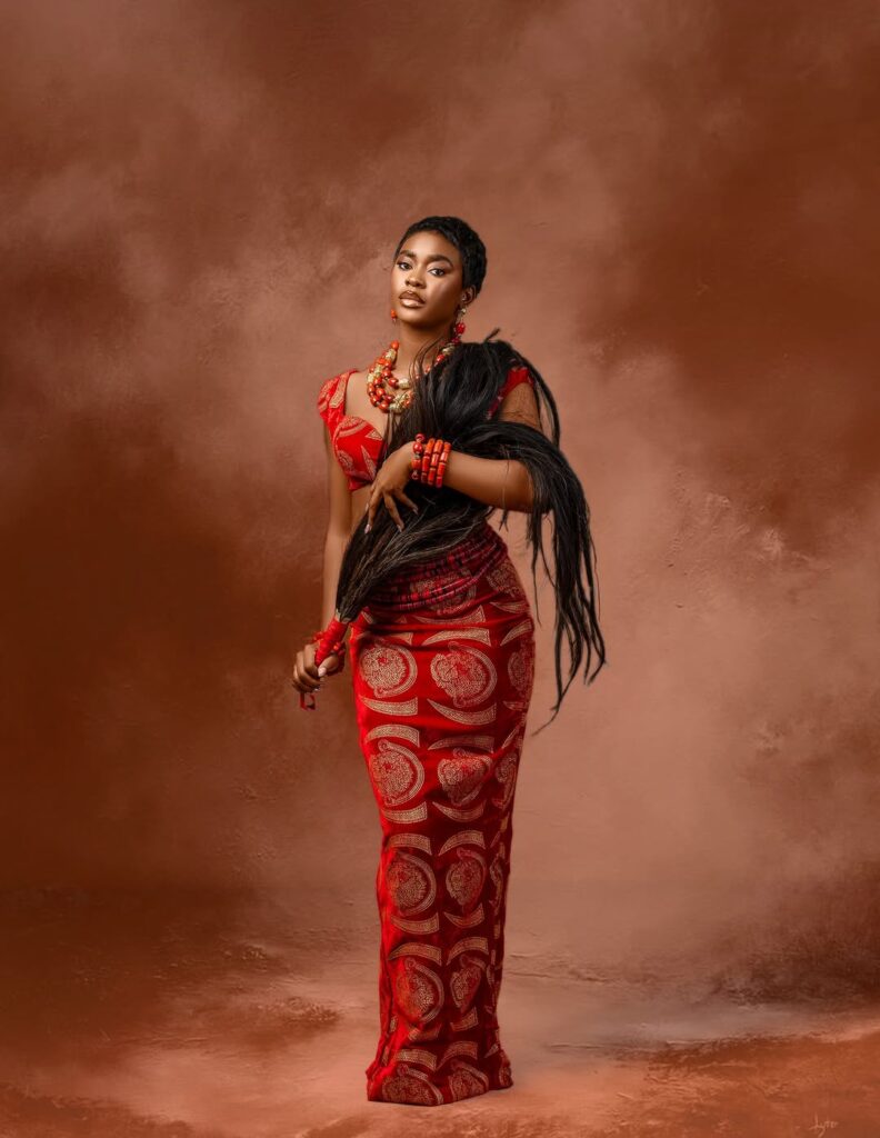 She stunned in a rich red George fabric skirt adorned with golden embroidery that instantly catches the eye. The standout corset top, with its daring cut-outs, added a striking twist to the traditional fabric. Draped with a matching wrapper that brought texture and flow, her outfit was the perfect balance of culture and class. Soft glam makeup and a sleek hairstyle completed the look effortlessly, letting her outfit take center stage.