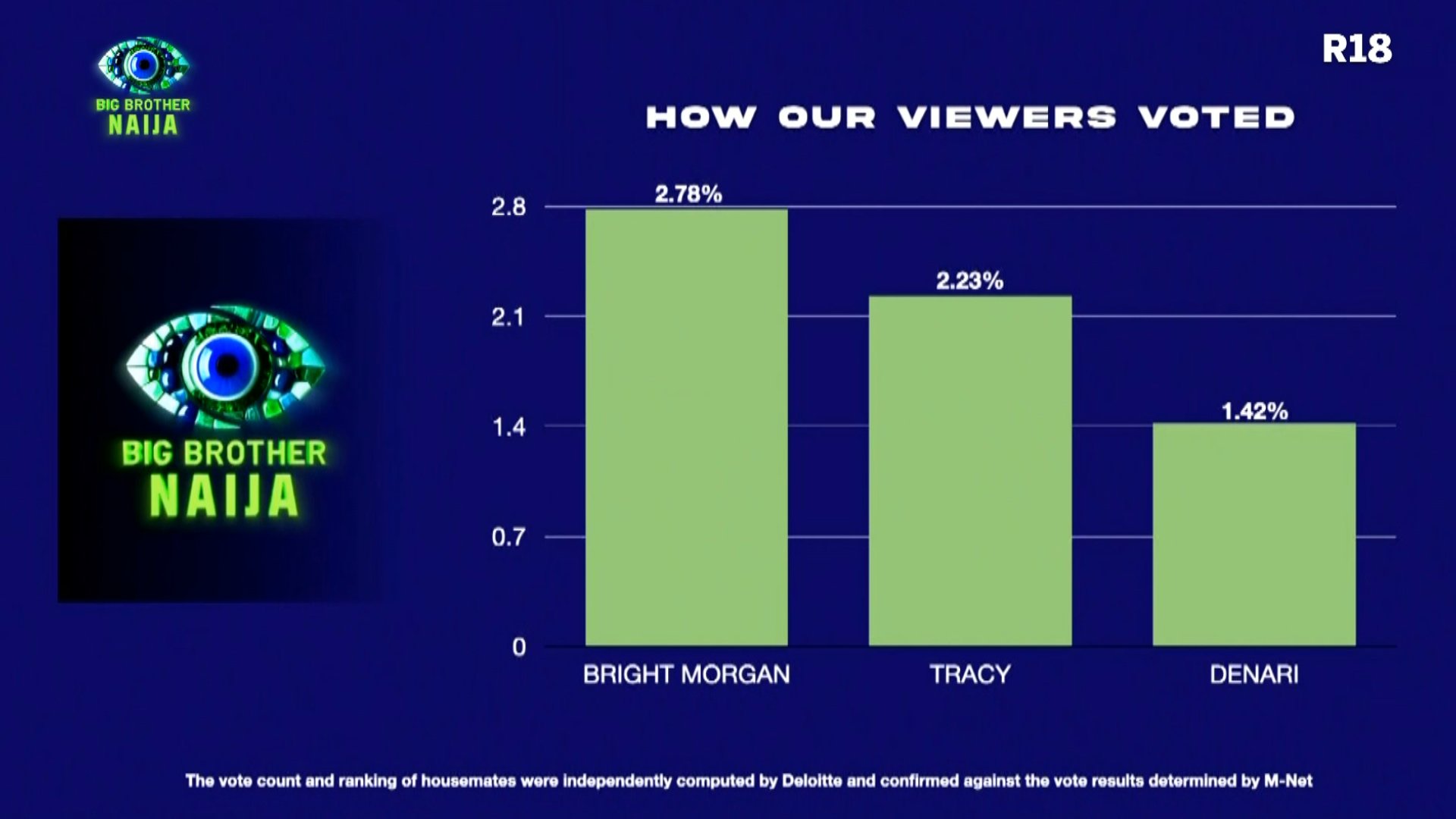 According to results tallied by Deloitte for M-Net, Tracy received 2.23% of the votes while Denari got 1.42%. Bright Morgan narrowly escaped with 2.78%. With their eviction, the housemates are now down to 17, all still eyeing the ₦150 million grand prize.