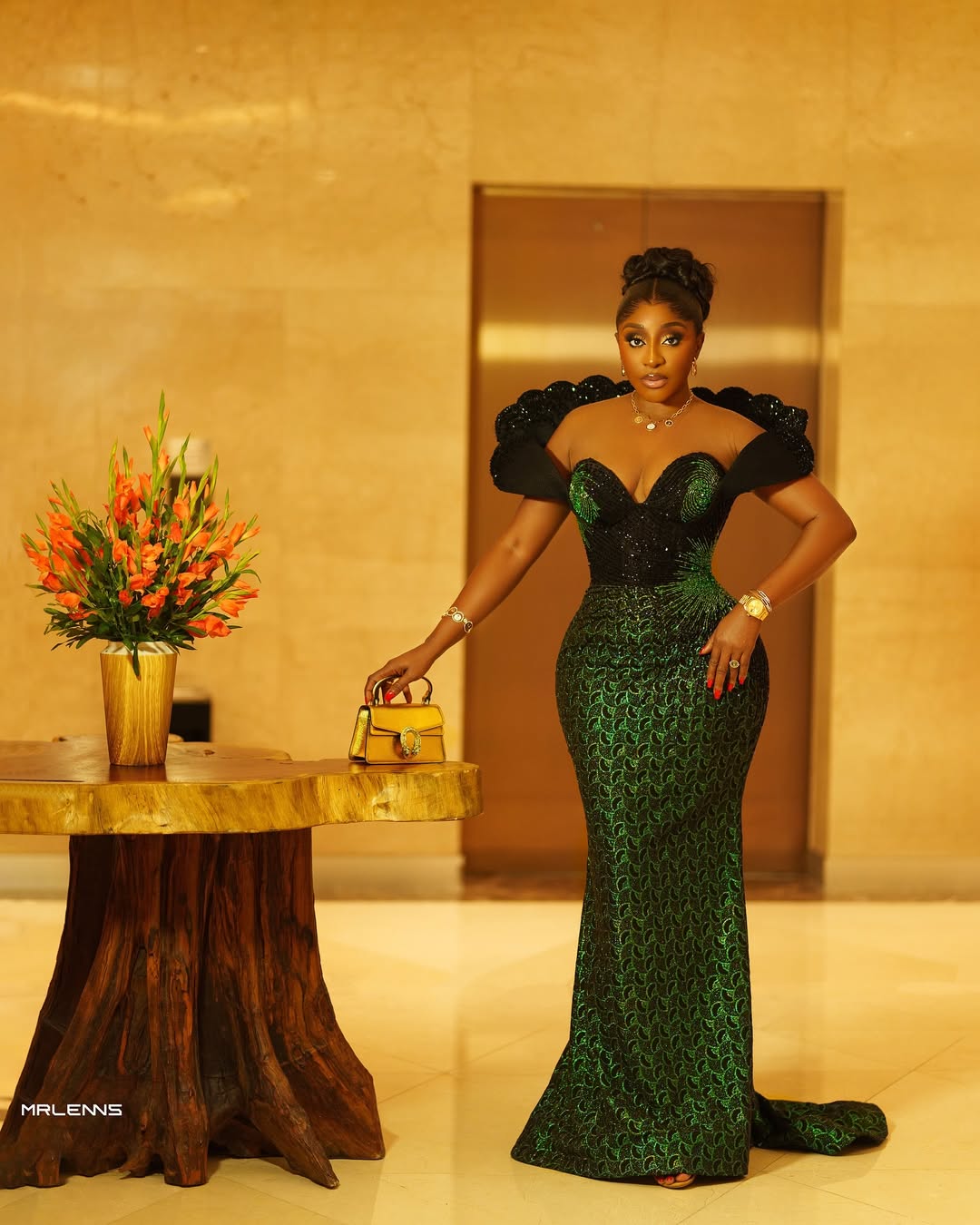 The guest list sparkled with top names and stunning looks. Funke Akindele turned heads in a structured gown featuring butterfly-like details in rich green and shimmering gold—bold, regal, and unforgettable. Ini Edo chose a more understated elegance, rocking a fitted dress with soft green highlights, while Kate Henshaw—who shares a birthday with the celebrant—graced the event with timeless poise.