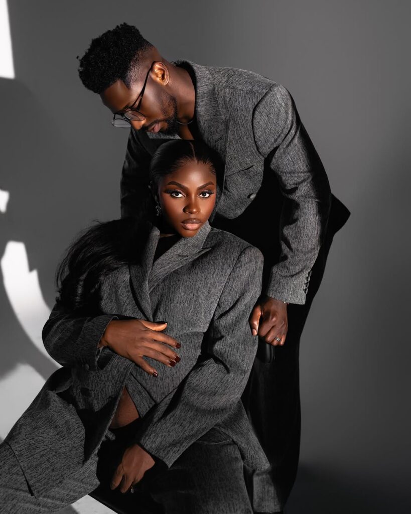 The new images capture their bond beautifully. In one, Prudence sits with quiet elegance while Peterson leans gently over her shoulder. Both wear oversized grey suits with textured detailing—a modern, minimal look that swaps frills for sharp tailoring. With her hand resting on her bump and his presence close beside her, the shot radiates both strength and tenderness. The dramatic lighting adds depth, making the moment feel powerful and intimate all at once.
