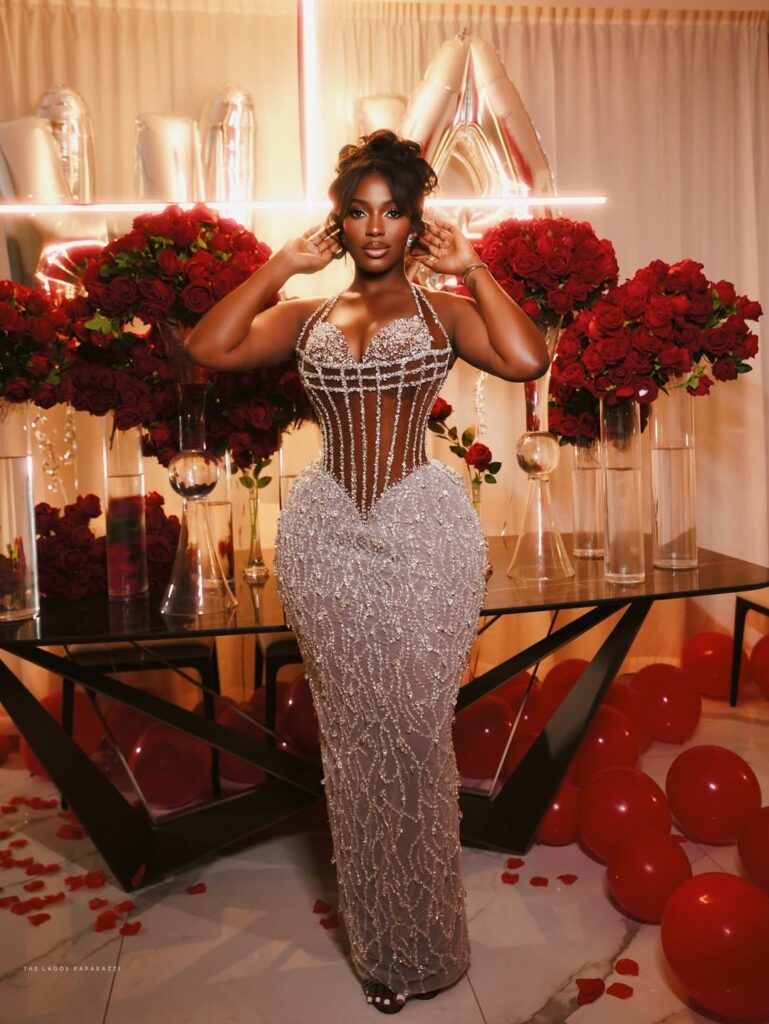 Wearing a custom Veekee James masterpiece, she instantly commanded the room. The silver gown shimmered under the lights, every bead intricately placed to catch the eye. A corset bodice with halter straps highlighted her figure, while bold geometric patterns down the torso gave the dress a striking, almost sculptural edge. Behind her, a sweeping mermaid train followed gracefully, adding the perfect touch of drama.