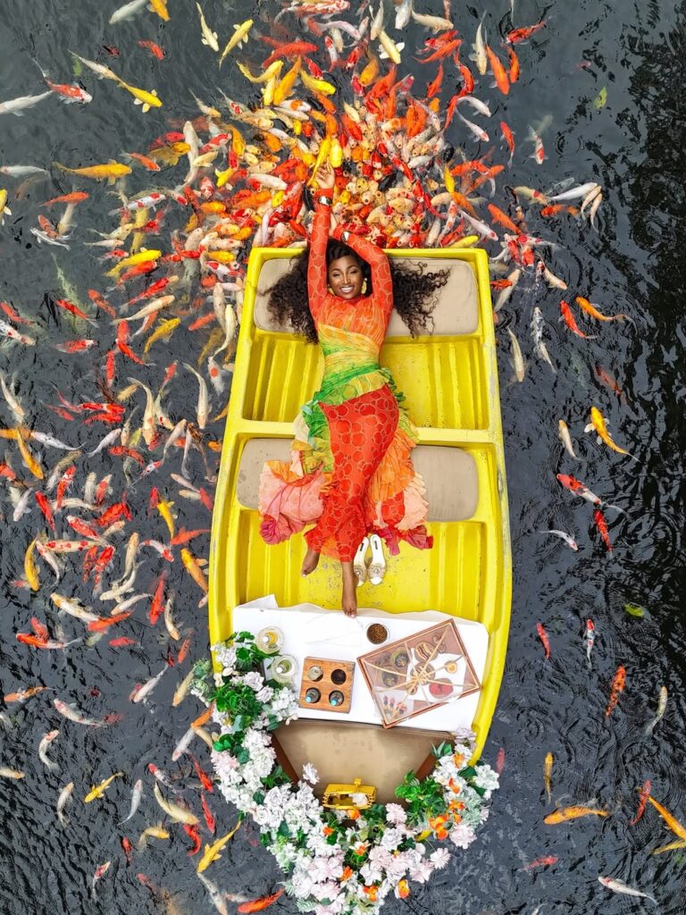 Dressed in a flowing orange maxi with playful circular patterns and pops of green and yellow, Omowunmi blends perfectly into the warm, sun-soaked backdrop. The colors of her dress mirror the vibrant hues of the fish swimming just beneath her, creating a picture that feels soft, alive, and intentional.