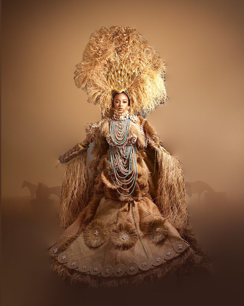 Raffia strands followed her frame with soft movement, coral beads added bright warmth, and cowries glimmered as gentle emblems of womanhood. Her towering headpiece reached upward as if connecting earth and spirit, while the woven mat beneath her feet honoured the hands of those who worked the land before her. The mix of warm browns, fresh greens, and bursts of colourful beads painted a story of growth, abundance, and the courage of Nigerian women.