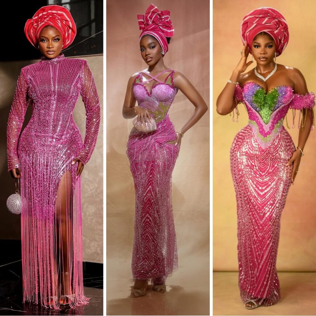 On the wedding day, they made sure to carry that same energy into the ceremony. Dressed in matching pink lace and striped asooke geles, they created a striking, cohesive look that lit up the entire celebration.