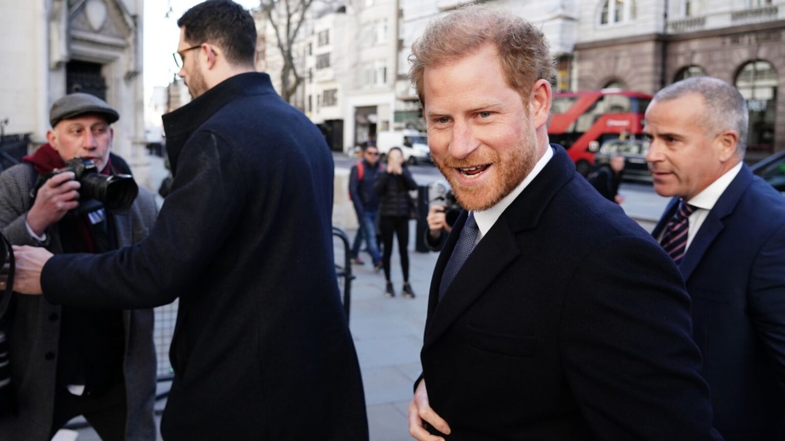 A smiling prince was seen arriving at the Royal Courts of Justice in central London, flanked by bodyguards, dressed in a suit and tie and a black winter coat, and surrounded by reporters and photographers.