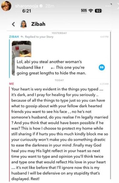 Addressing trolls who speculated about her marital status and suggested she had taken someone else’s husband, Ooja fired back in a series of now-deleted Instagram Story posts. She shared screenshots of her exchange with a troll on Snapchat, vehemently denying the accusations and defending her husband’s honor.