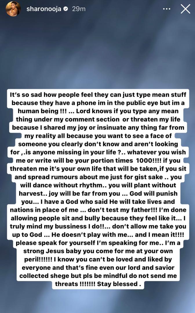 She continued, warning against crossing her, “Don’t push me to involve divine intervention. I have a God who defends me fiercely. So, mind your words. I’m standing up for myself now. I refuse to tolerate bullying. I stay in my lane, but don’t provoke me. I’m a strong believer, and I won’t hesitate to bring down divine justice on those who harass me. You’ve been warned!”