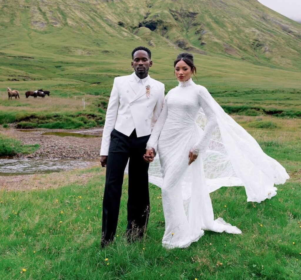In August, the final chapter unfolded in Iceland with a white wedding straight out of a fairytale. Temi walked down the aisle of Hallgrimskirkja church in Fendi Haute Couture to Wagner’s “Bridal Chorus.” Their reception took place at Kleif Farm in a glass tent framed by moss and volcanic stone, blending nature with elegance. The night featured a surprise performance by John Legend, capped off with an arctic beach party under the Northern Lights.