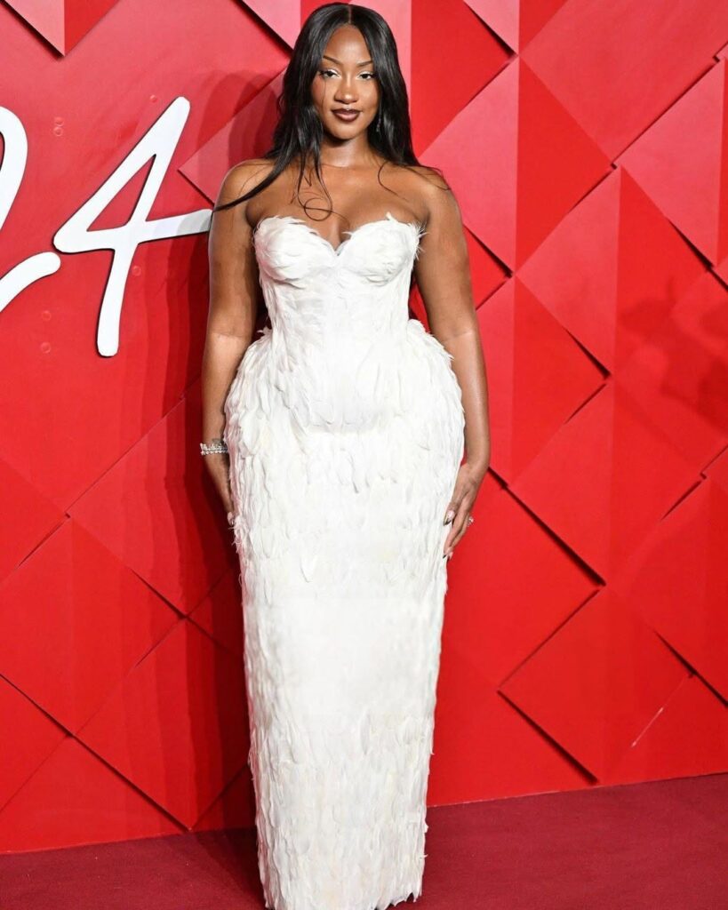 Tems, the sensational Nigerian singer taking the world by storm, was the epitome of grace and glamour at The Fashion Awards presented by Pandora! Known for her effortless style, she rocked a breathtaking feathered gown by Dilara Findikoglu that had everyone talking. Paired with her signature 90s-inspired makeup—think bold brows, shimmering silver eyeliner, and perfectly lined cocoa lips—she looked every bit the superstar she is.