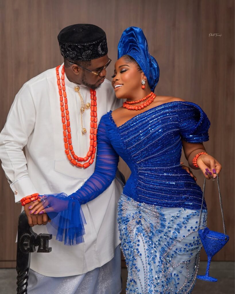 Of course, Veekee didn’t stop at the dress. She tied the whole look together with a matching blue gele, stacked coral beads, and a sparkling purse shaped like a cocktail glass—yes, you read that right. It wasn’t just an outfit; it was a whole fashion moment in electric blue.