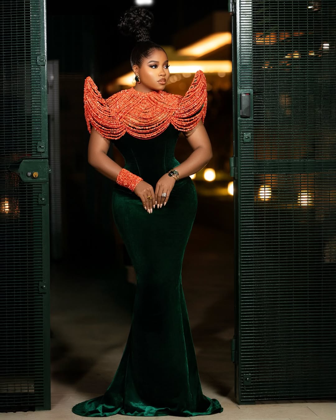 But just when we thought we had seen the full picture, she flipped the script. Enter: the cape. A coral-red masterpiece, beaded to perfection and worn like modern-day regalia. It framed her shoulders and torso with elegance and strength. And yes, there was a matching cuff because Veekee doesn’t do halfway.