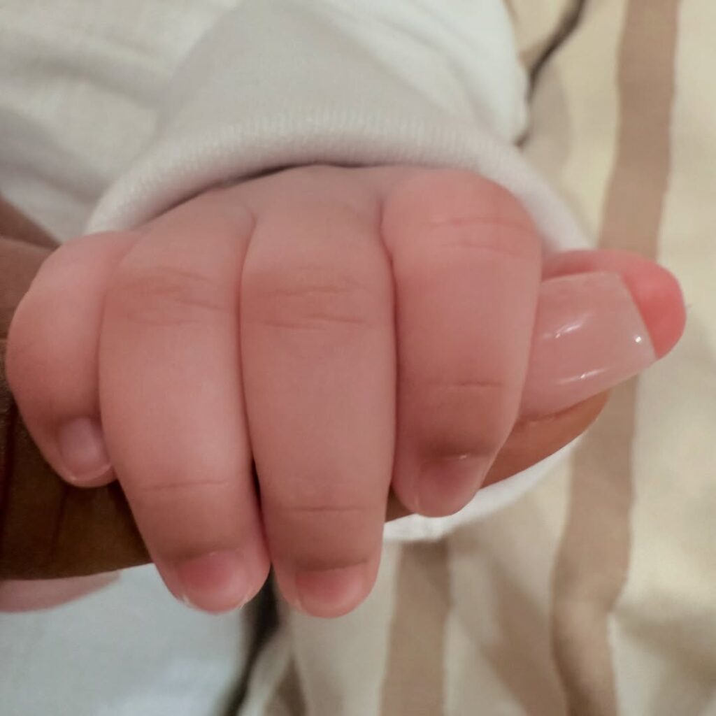 Now, she celebrates the sweetest chapter of all. Posting a carousel that included her baby’s tiny fingers curled around her thumb, she wrote: