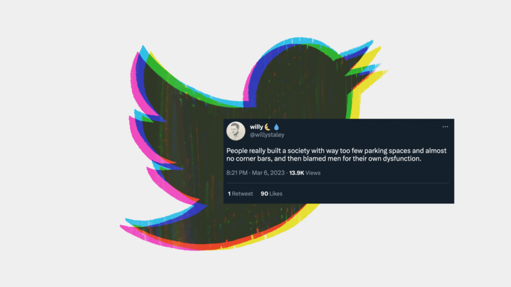 People really built a society with way too few parking spaces and almost no corner bars, and then blamed men for their own dysfunction.