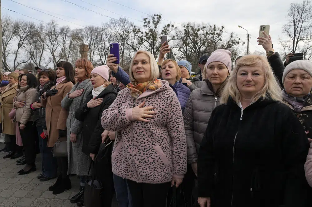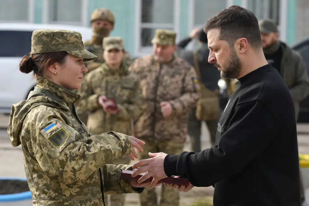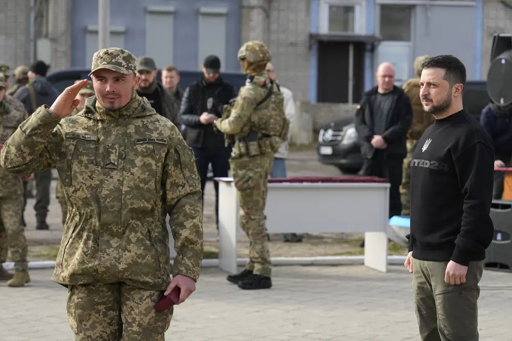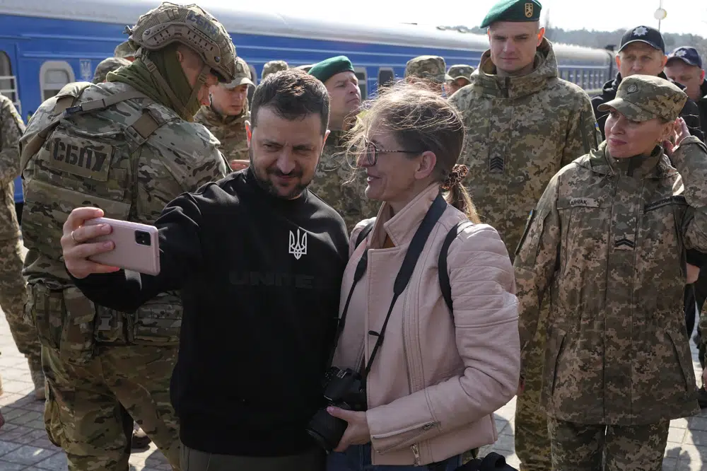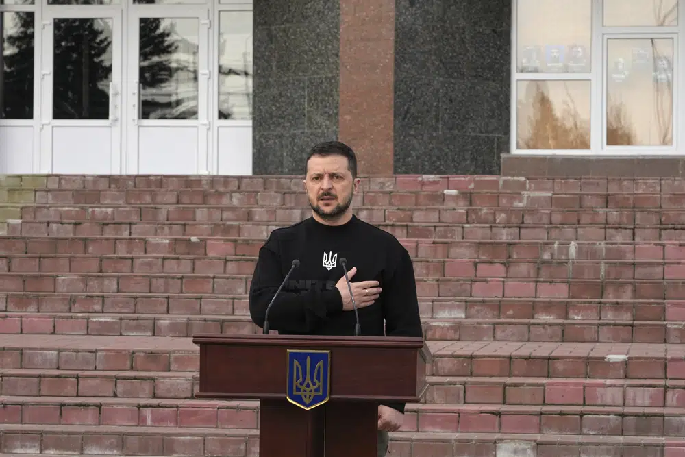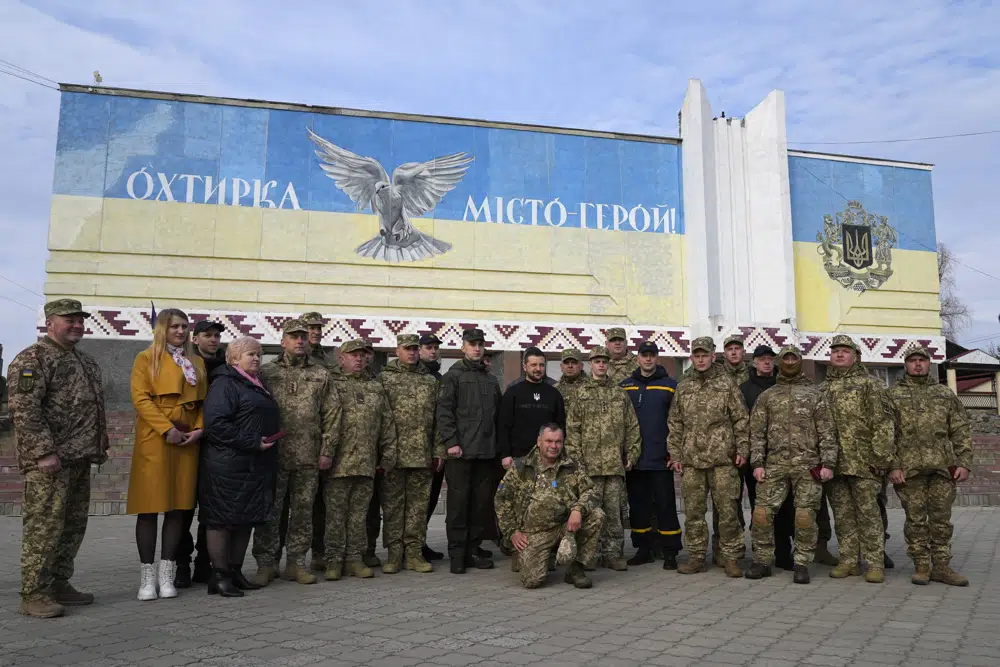 The Associated Press was given exclusive access as Zelenskyy visited Okhtyrka, which saw fierce battles last year but was never occupied, and Trostianets, which was held by Russian forces for a month after the invasion but retaken by Ukrainian forces on March 26, 2022.